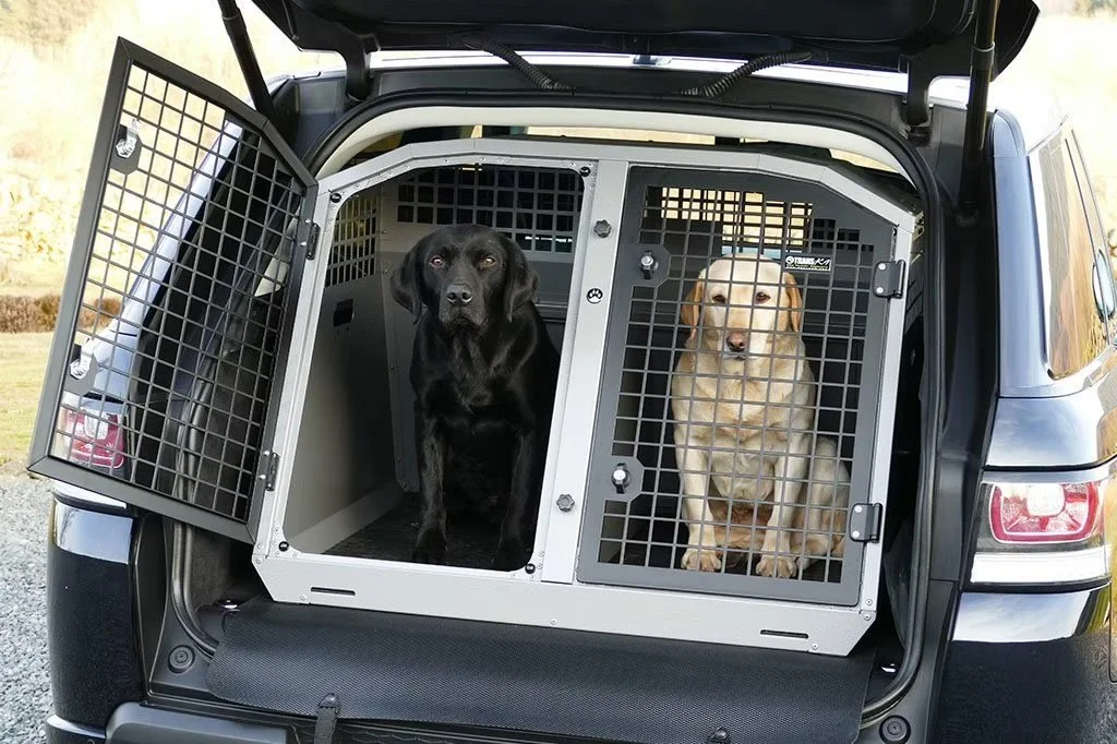 Dogs travel in a professionally outfitted vehicle, riding in crash-tested kennels designed for both safety and comfort. These are not plastic airline crates stacked together, nor are they part of long, multi-stop routes. Each dog has their own secure, cozy space that allows them to settle and rest while traveling alongside familiar companions.